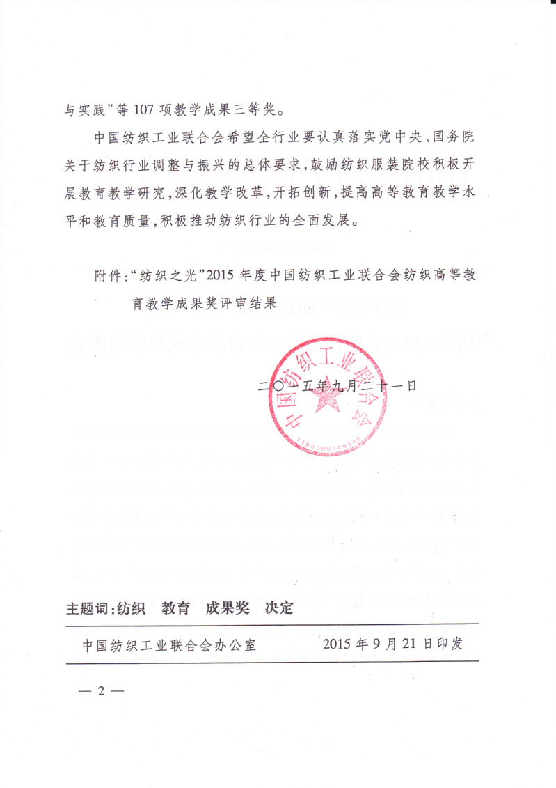 关于授予“纺织之光”2015年度中国纺织工业联合会纺织教育教学成果奖的决定