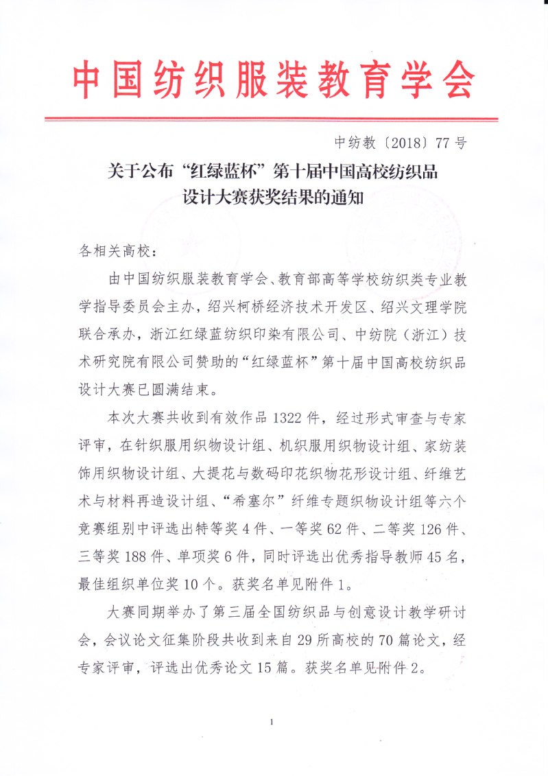 关于公布“红绿蓝杯”第十届中国高校纺织品设计大赛获奖结果的通知