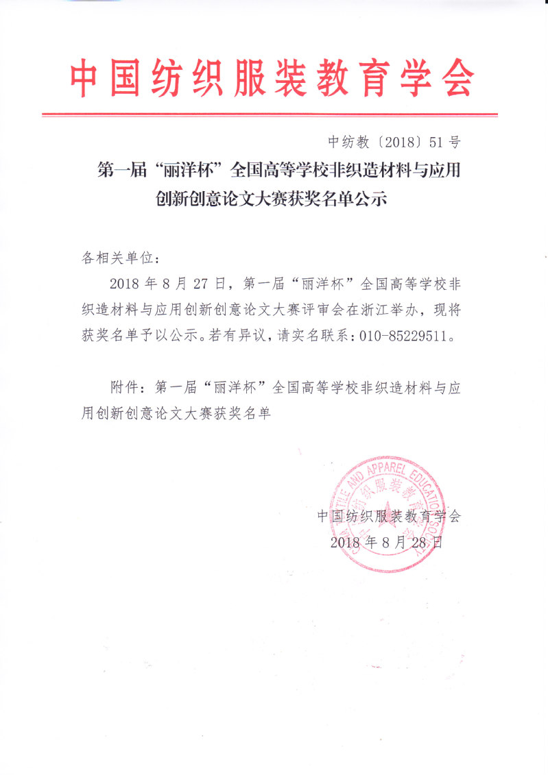 第一届“丽洋杯”全国高等学校非织造材料与应用创新创意论文大赛获奖名单公示