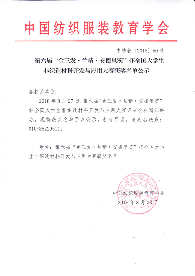 第六届“金三发·兰精·安德里茨”杯全国大学生非织造材料开发与应用大赛获奖名单公示