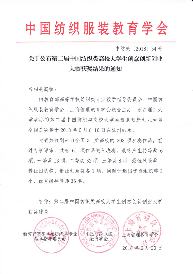 关于公布第二届中国纺织类高校大学生创意创新创业大赛获奖结果的通知