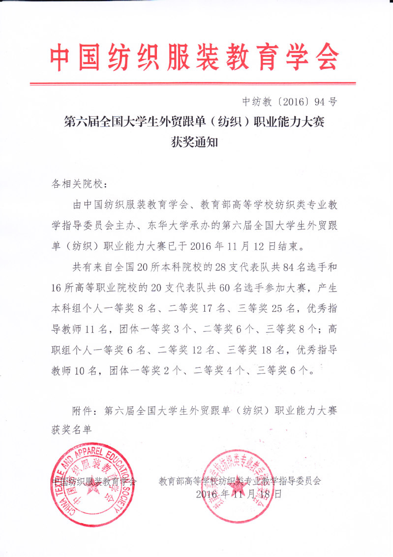 第六届全国大学生外贸跟单(纺织)职业能力大赛获奖通知
