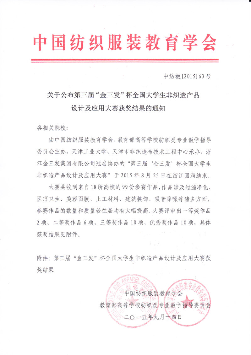 关于公布第三届“金三发”杯全国大学生非织造产品设计及应用大赛获奖结果的通知