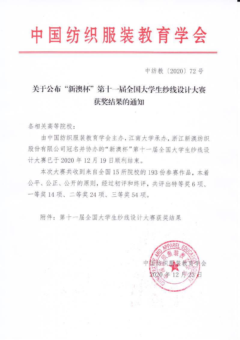关于公布“新澳杯”第十一届全国大学生纱线设计大赛获奖结果的通知