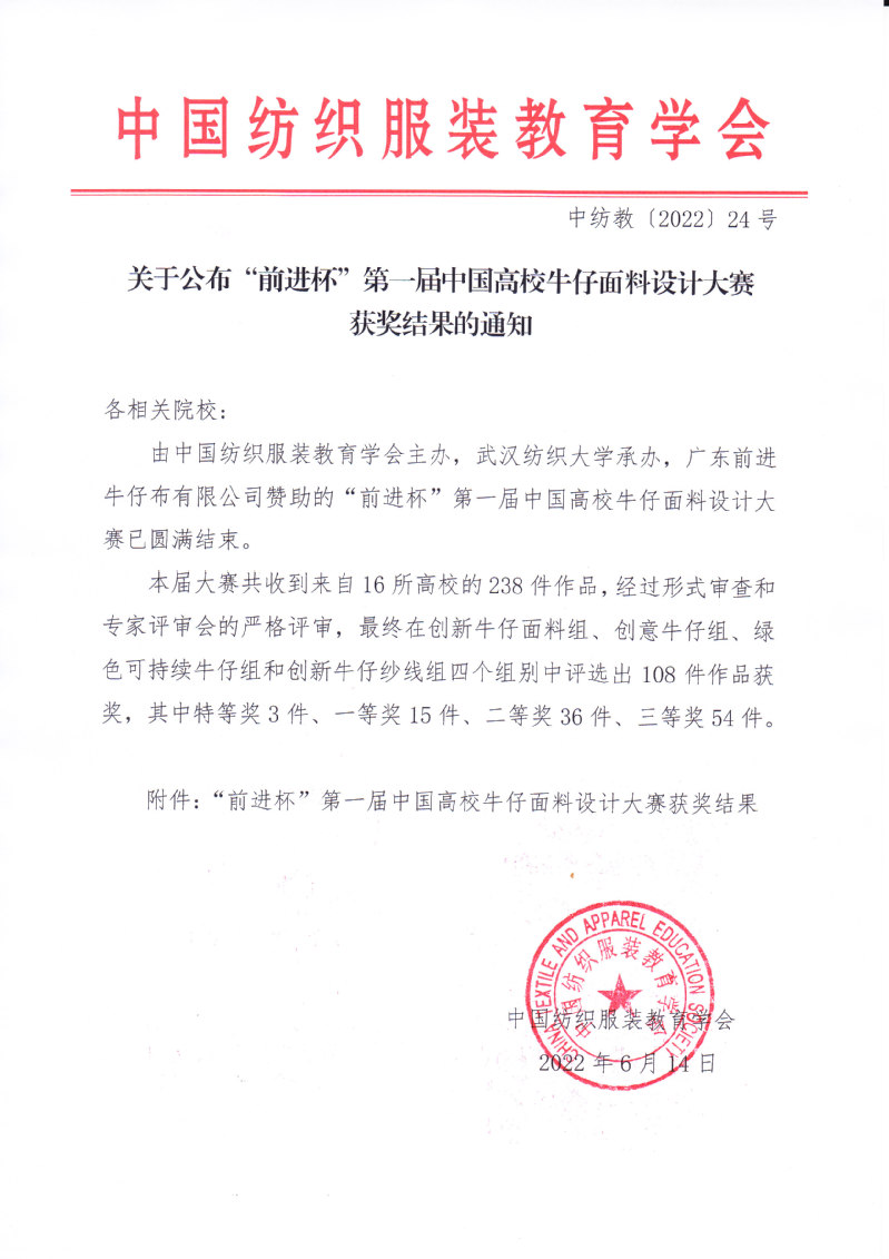 关于公布“前进杯”第一届中国高校牛仔面料设计大赛获奖结果的通知