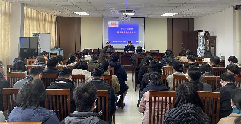 经济与管理学院教授韩裕庆以“学二十大精神,踏中国式现代化之路”为主题,结合生动具体的事例,分别从中国式现代化的提出、理论渊源、中国特色、战略安排、理论意蕴五个方面,引领学院师生进一步深入理解中国式现代化理论的核心要义、科学认识实现中国式现代化的有利条件和面临的挑战、坚定“必须坚持以中国式现代化推进中华民族伟大复兴”的信心和决心。