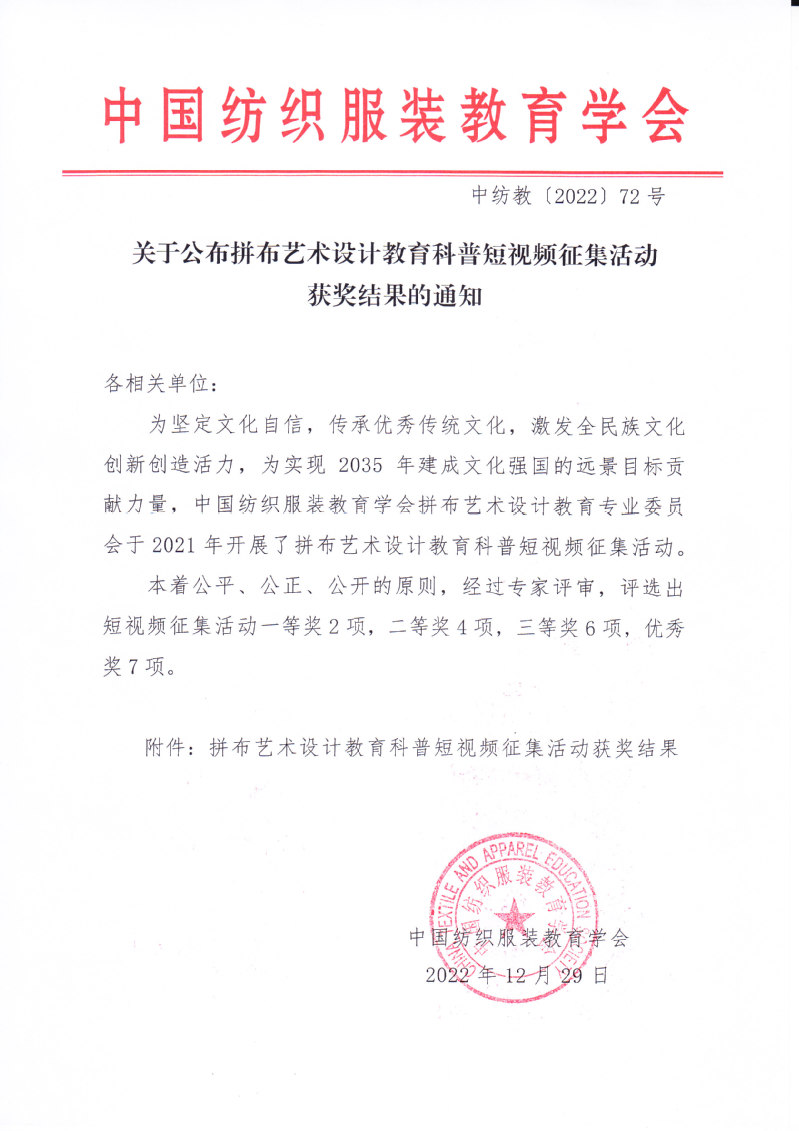 关于公布拼布艺术设计教育科普短视频征集活动获奖结果的通知