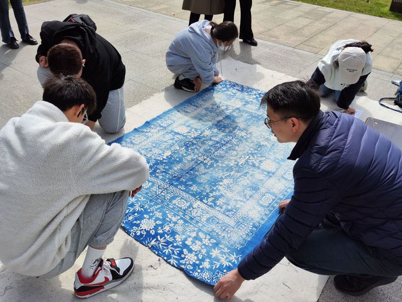 活动中,志愿者们分工明确,有序分成三组,协助场馆工作人员整理拍摄蓝印花布,并向参观人员讲解每块布上的花纹含义及其背后的美好寓意。志愿者们服务热情高涨,充分发扬着不怕苦、不怕累的精神。