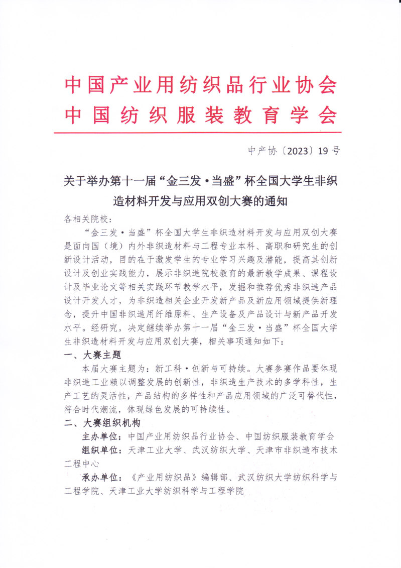 关于举办第十一届“金三发·当盛”杯全国大学生非织造材料开发与应用双创大赛的通知