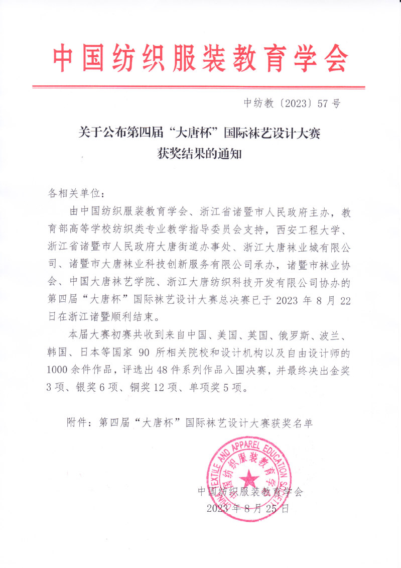 关于公布第四届“大唐杯”国际袜艺设计大赛获奖结果的通知