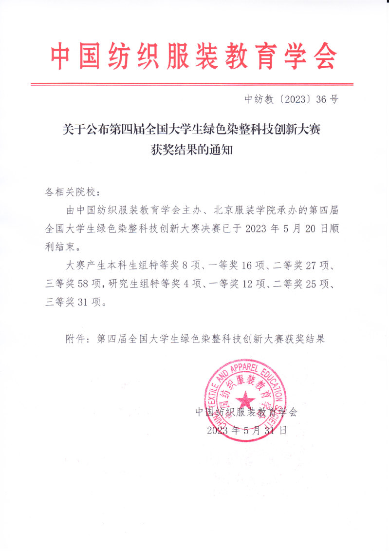 关于公布第四届全国大学生绿色染整科技创新大赛获奖结果的通知