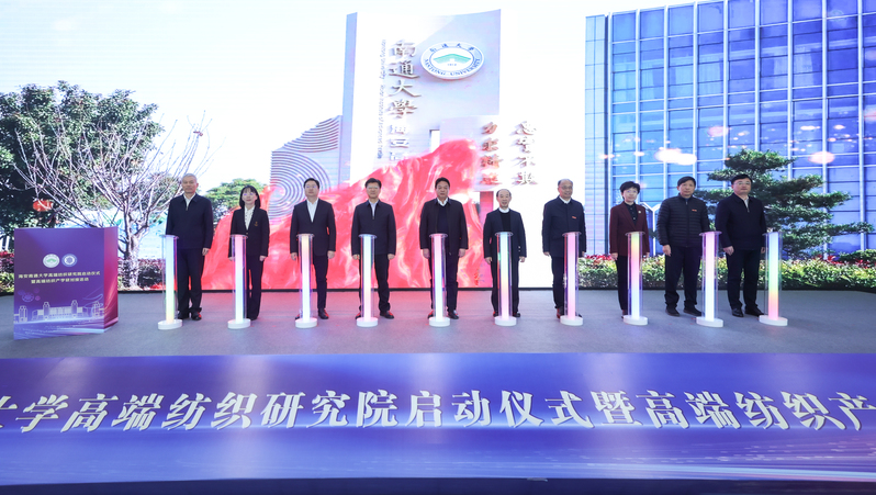 12月18日,海安南通大学高端纺织研究院启动仪式暨高端纺织产学研对接活动在海安市常安现代纺织科技园举办。中国工程院院士、东华大学教授孙以泽,江苏省知识产权局二级巡视员施蔚,江苏省纺织工程学会理事长周洪溶,南通市人民政府副市长于立忠,校党委副书记、校长杨宇民,海安市委书记谭真,海安市委副书记、市长赵男男,南通市纺织工程学会理事长樊小东,南通市教育局副局长许新海、南通市知识产权局专职副局长蒋爱龙共同为研究院按下启动键。校党委常委、副校长施佺,校党委常委、副校长莫晨宇出席仪式。校党委常委、副校长华亮主持启动仪式。
