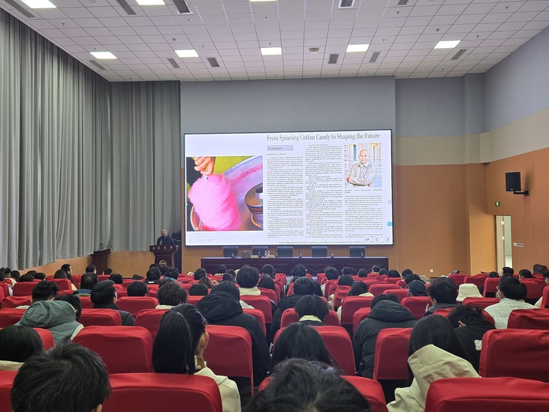 Seeram教授以《Future of Fiber Materials》为题作学术报告,介绍了新加坡国立大学的基本情况,阐释了可持续材料和智能材料等材料科学未来发展方向,并分享了纤维材料的未来发展方向。报告深入浅出地介绍了静电纺丝的原理,通过修饰和表面改性制备各种功能性纳米纤维,并展示了其课题组将纳米纤维应用于空气过滤、生物组织支架、能源储存、可穿戴电子设备以及大脑科学等领域的研究成果。报告后,Seeram教授对现场老师和学生提出的问题进行了详细的解答,以丰富的科研实例和前沿的科技信息开阔了师生的视野。