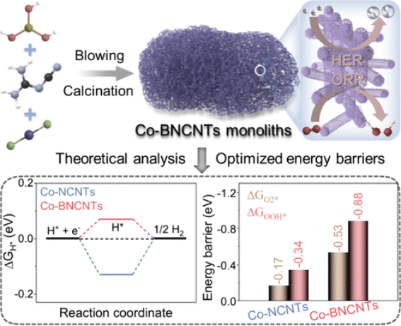 该研究率先制备了三维碳纳米管块体材料,揭示了硼引入对三维碳纳米管块体结构、析氢反应和氧还原反应能垒的调控机制,从而表现出优异的电催化性能;构筑的锌空气电池具有较高的功率密度186.2mW cm-2和300小时的稳定循环,为理性设计低成本、高性能催化剂提供了新思路。该研究得到了国家自然科学基金、江苏省自然科学基金、江苏省高等学校基础科学(自然科学)面上项目和南通大学高层次人才科研启动基金的支持。