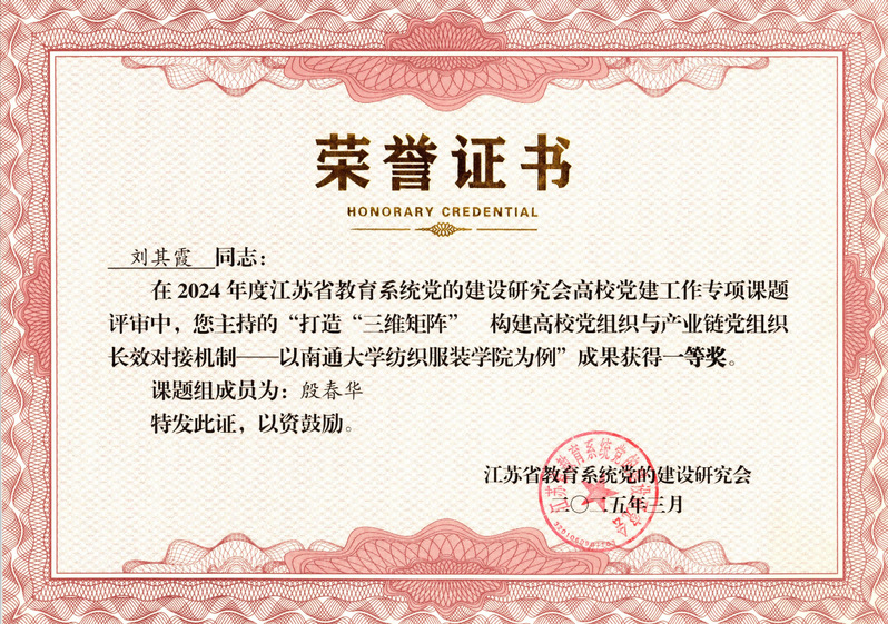 近日,江苏省教育系统党的建设研究会组织开展的2024年度高校党建工作专项课题评审结果公布,由纺织服装学院党委书记刘其霞主持、党委副书记殷春华参与的《打造“三维矩阵” 构建高校党组织与产业链党组织长效对接机制——以南通大学纺织服装学院为例》课题荣获一等奖。