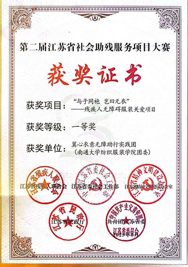 6月20日至21日,第二届江苏省社会助残服务项目大赛暨长三角地区社会助残服务项目分享会在南京成功举办。本次大赛由江苏省残疾人联合会、省委社会工作部、省文明办、省民政厅、共青团江苏省委联合主办。经过激烈角逐,纺织服装学院“翼心衣意”无障助行实践团的“与子同袍 岂曰无衣——残疾人无障碍服装关爱"项目凭借设计创新和科技赋能,从174个申报项目中脱颖而出,荣获大赛一等奖。